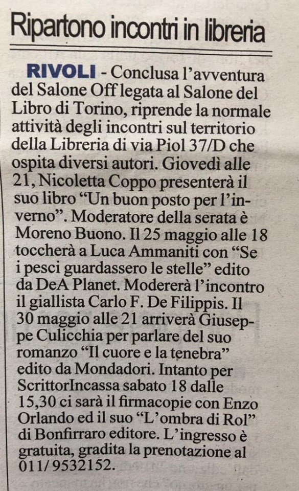 Anche Luna Nuova vuole ricordare gli incontri che si terranno domani presso la nostra libreria di Rivoli in via Piol 37/D. Dalle 15.30, per l'iniziativa ScrittorIncassa sarà presente Danilo Tacchino, che firmerà le copie del suo libro "Torino, miti e leggende della fondazione". Alle 18  inizierà la...