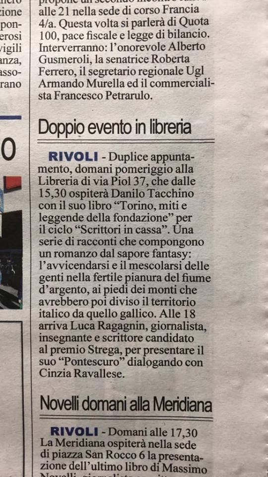 Anche Luna Nuova vuole ricordare gli incontri che si terranno domani presso la nostra libreria di Rivoli in via Piol 37/D. Dalle 15.30, per l'iniziativa ScrittorIncassa sarà presente Danilo Tacchino, che firmerà le copie del suo libro "Torino, miti e leggende della fondazione". Alle 18  inizierà la...